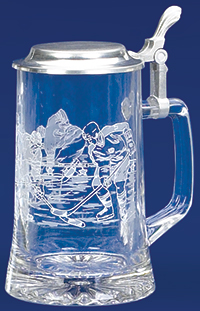 Decorated with etched-style print portraying a scramble for the puck. Pewter lid, suitable for engraving.