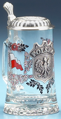 A three-color direct print is permanently fired on the stein body. On the both sides are the Polish white & red flags. A pewter applique is in the front of the stein, prominently displaying the word POLSKA and the Polish Eagle beneath it. On the lid is a symmetric pattern of oak leaves, acorns and the word POLAND visible in all four directions. Similar to item 5967.