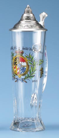 This sleek stein features a tapered glass body with a bold Bavarian Crest design that proudly states, Gott Mit Dir Du Land Der Bayern. A conical pewter lid finishes this classy stein.