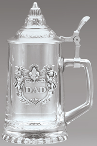 The stein's smooth, sturdy glass body is tapered and has a starburst light reflecting pattern on the bottom. A conical pewter lid rests above a Dad coat of arms. The lid has a special threaded hinge pin that can be loosened and tightened with an allen wrench to easily remove and reattach the lid.