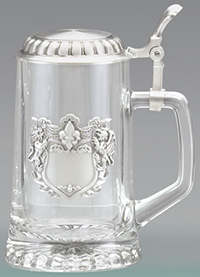 A handsome glass stein with starburst light reflecting pattern bottom and an engraveable coat of arms medallion. The conical pewter lid is removable allowing for easy access to the glass body. To remove or reattach the lid, simply loosen or tighten the threaded hinge pin with an allen wrench.
