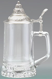 This smooth, sturdy glass body is tapered and has a starburst light-reflecting pattern on the bottom. The conical pewter lid is removable, allowing for easy access to the glass body. The stein has a special threaded hinge pin. The lid is easily removed and re-attached by simply loosening and tightening this hinge pin with an allen wrench.(This product is also a part of our custom line. For more information about our custom products and services, visit our custom gifts website at www.custom-steins.com, or see our collections of stoneware and glassware mugs) "
