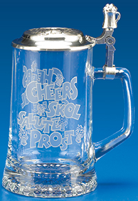 This glass stein has a decal decoration with various languages words for toasting. We have Cheers, Skol, Salute, and Prost. The flat pewter lid has an embossed design on top and a frothy pewter mugs forms the thumblift.