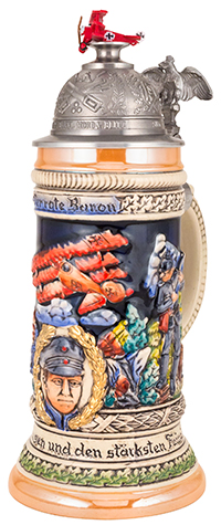 Stoneware, raised-relief decoration. World War I flying ace Manfred von Richthofen is framed by aircraft and banners of the era. The highly polished pewter lid is adorned with a hand painted miniature red Fokker triplane figurine. Limited edition of 4,000 pieces. Registered and individually numbered.