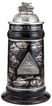 This stein was created to honor those who are serving and have served in the U.S. Armored Forces; their patriotism, discipline and self-sacrifice has not gone unnoticed. The body of the stein is a smooth, black glazed, high quality stoneware decorated with a platinum wrap around design. Along the top border of the stein are the words, THE HISTORY OF THE U.S. ARMORED FORCES. The left side of the platinum design features a timeline detailing significant events in the history and creation of the U.S. Armored Forces, beginning with the year 1916 when General Pershing first used tractors on an expedition. Images of different armored vehicle designs from 1917 to 1944 adorn the left side as well. The right side of the stein features additional images of armored vehicle designs from 1951-1993s. The timeline from the left side continues on the right, beginning with events in 1945 and ending with present day. A pewter medallion replica of the U.S. Armored Forces insignia is attached opposite the handle of the stein. The design is based on the triangular coat-of-arms of the American WWII Tank Corps. Inside the triangle is a modified version of the insignia of the former Seventh Cavalry Brigade (Mechanized), the predecessors of the Old Ironsides. Different textures in the three sections of the triangle replace the bright colors of the insignia. Along the bottom in bold letters are the words U.S. ARMORED. Rows of raised stars decorate the ornamental pewter lid and fixed to the top is an intricately detailed pewter figurine of the Sherman tank (1942). A pewter version of the U.S. eagle crest serves as the thumblift for this noble stein. Limited edition of 5,000 individually numbered pieces.