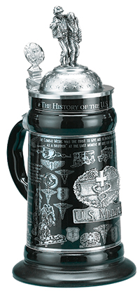 This stein had been created to honor the work of the US Medic in the past, the present and the future. The body of the stein is a smooth, black glazed, high quality stoneware decorated with a platinum wrap around design. Along the top border are the words, The History of the US Military Medics. The left side of the platinum design features a variety of Medic vehicles, emblems, and images of medics aiding and tending the wounded. Also along the left side is the first half of a timeline detailing the creation, advancement, sacrifices and participation of the US Military Medic beginning in 1775 when the Army Medical Department was formed through 1959-1975 The Vietnam War. A pewter replica of a US Military Medic emblem ornamented by the words U.S. Medic appears at the center of the wrap around decoration opposite the handle of the stein. Below the badge are various medic service emblems. The right side of the platinum design features more images of medic vehicles, emblems and a surgical team at work. The timeline from the left side continues on the right picking up in 1961 and concluding in 2005 with Aid provided after Hurricane Katrina. A detailed pewter figurine of a military medic aiding an injured soldier is fixed on top of the ornamental pewter lid. Limited edition of 5,000 individually numbered pieces.