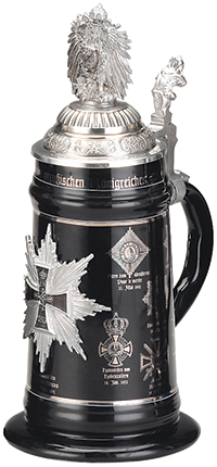 A tribute to the Iron Cross Medal, this stein traverses history detailing each version of this honorable medal beginning with the first, created on March 20, 1813. In 1807, after Prussia's defeat, it was forced into subservience to the French and was unable to break their bond with Napoleon until, in 1812 when Napoleon was retreating from Moscow, the Prussian army found an opportunity to change sides and allied themselves with Russia. Shortly after, a new medal, the Iron Cross, was created to commemorate the start of the war against Napoleon. The silver print against the stein's black, stoneware body creates a stunning contrast. A pewter Iron Cross appears opposite the handle and a pewter German eagle is mounted on the lid. Limited edition of 5,000 pieces.