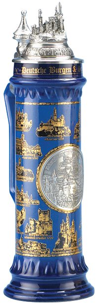 This stoneware, tower-shaped stein is decorated with a vibrant blue glaze and gold wrap-around design featuring sixteen images of historic castles of Germany. Fixed to the center of the stein is a detailed pewter badge with a map of Germany overlaid on a magnificent Neuschwanstein Castle scene. A pewter figurine of Neuschwanstein Castle is fixed to the ornamental pewter lid and castle tower pewter thumblift completes the piece. Limited edition of 5,000 individually numbered pieces.