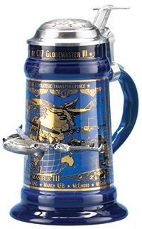 The body of the stein is a smooth, blue glazed, high quality stoneware decorated with a gold wrap around design. This stein has been crafted to highlight the progression of the manufacture and career of the C17 Globemaster III. A detailed pewter figurine of the from half of a C17 Globemaster III, including wings is situated at the center of the wrap around decoration, such that it looks like the plane is flying out of the stein. To left and right of the figurine are a number images of the plane flying and a timeline of the history of the C17 Globemaster III. An ornamental pewter lid with raised pewter globe complete with compass rose and a pewter figurine of the tail of the plane completes the piece. Limited Edition of 5,000 individually numbered pieces.