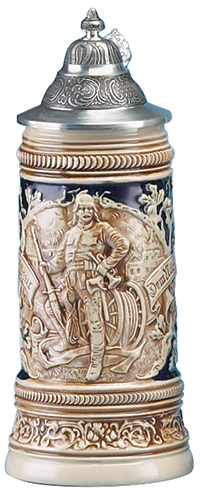 This stoneware, raised relief stein hosts a turn of the century full dressed fire fighter a hose and trumpet. Burning buildings are seen in the background. The German expression on the sides is translated to say, God protect the next one called to duty, one for all and all for one. Border decorations include ladders, axes, and helmets. The entire stein is in an antique four tone, cream, brown, emerald green and cobalt blue color combination. Affordably priced.