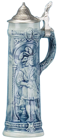 Stoneware, raised-relief, two-panel gladiator design. Ornamental pewter lid. Two-tone blue/gray color combination.