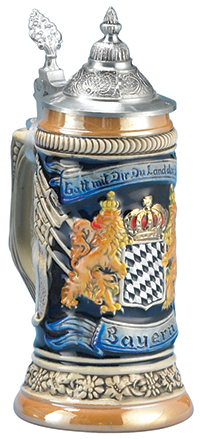 Stoneware, raised relief decorations of the Bavaria coat of arms with lions diamonds and crowns adorn this stein. These decorations are colored with eight accent colors, including gold relief, and highlighted by a dark blue background. A conical pewter lid completes the stein.