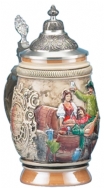 The detail of these traditional steins sculpted decades ago are preserved with a subtle dark gray all-over glazing and matte finish. Antique conical pewter lid. Assorted folklore motifs. Selective hand-painted subjects.