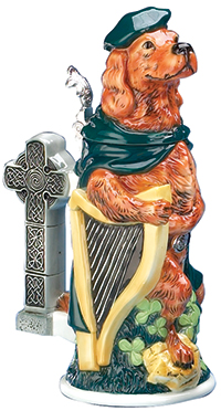 This is the 9th edition in the Man's Best Friend Series. An Irish Setter wearing a green cloak & cap with feather is a bard as evidenced by the harp underneath his arms. He is standing in an emerald field of shamrocks. The handle is a Celtic cross. The finishing touches are an emerald brooch holding the cloak at the neck, a platinum belt buckle and platinum knife handle. A concealed pewter lid is underneath the Irish Setter's head. Porcelain, hand painted figural decoration. Limited edition of 5,000 individually numbered pieces.