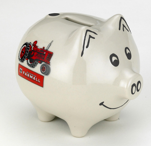 New and exclusive! White stoneware piggy bank with a vintage McCormick-Farmall tractor logo on the side.