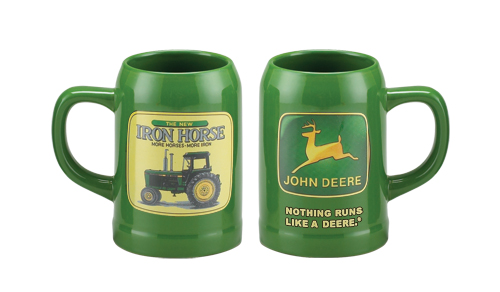 High grade stoneware mug with an individually hand formed handle and rich green glaze throughout. The 1968 Deere Company trademark with the phrase NOTHING RUNS LIKE A DEERE decorates one side of the mug. On the other side is a Model 4640 Tractor produced from 1978-1982. These new tractors were made with more horsepower, more iron, and internal structural changes to back up the power increases, thus becoming one of the Iron Horses as depicted on the mug. Official Licensed Product.