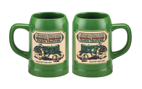 High grade stoneware body with an individually hand-formed handle and rich green glaze throughout. The inspiration for this mug is a reproduction from an illustration used with a 1929 GP Tractor sales folder announcing the Model GP General Purpose Farm Tractor. This model with steel wheels was produced by Deere and Company from 1928-1935. Using the original illustration, we now feature a counterpart view showing the other side of the tractor. Official Licensed Product.