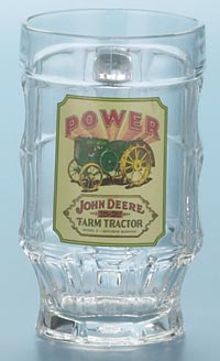 This glass mug features vintage artwork depicting a classic John Deere tractor with the word POWER looming overhead. Official Licensed Product.