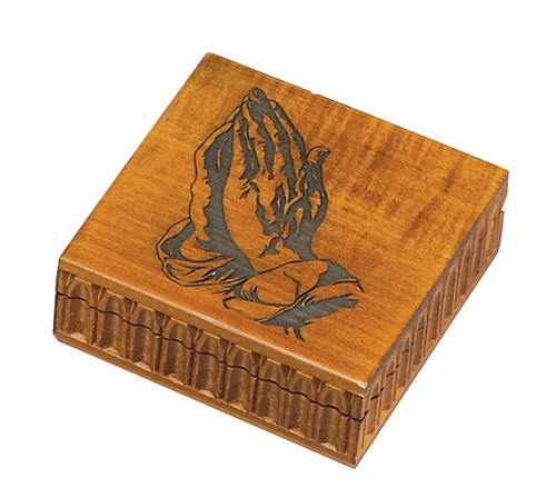This classic box has a laser engraved praying hands motif decorating the flat lid, a deep carved design around the sides, and a maple finish.
