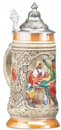 Stoneware, raised-relief decoration. Produced from an original 1894 mold, the degree of detail in this stein is truly exceptional. The stein features selective hand painting of the three main subject areas and careful application of background washes, border bands, and glazing. Relief conical pewter lid. This stein is a great value!