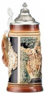 Stoneware, raised-relief decoration. This stein offers superb quality and value. The classic scene features the Lindenwirtin bringing a fresh drink to a traveler in a wonderfully detailed outdoor setting that captures every detail. The couple's costumes, the table setting, the surrounding trees, and building are all carefully preserved using a special four-color cobalt/emerald/ivory/brown hand-painted decoration. Relief conical pewter lid. This is truly one of the best-valued traditional steins.