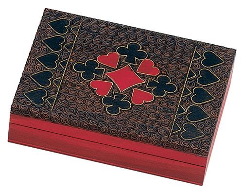 Brass inlay, partitioned. Card suits motif. Mahogany finish.