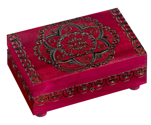 This trick box is decorated with a floral motif accented with metal inlay. Rotate the two front feet to unlock the lid and open.