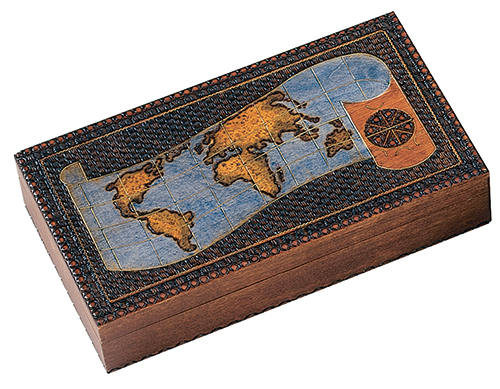 Hand carved and brass inlay. Excellent detail of a world map. Satin finish.
