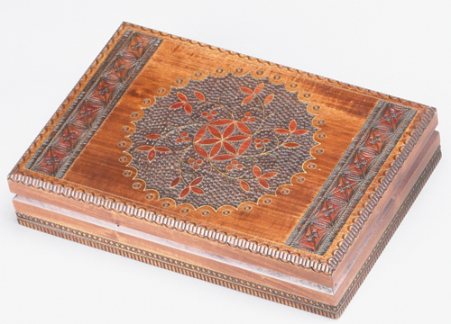 Very intricate carving and brass inlay on top and all 4 sides. Satin, 3-tone finish.