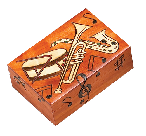 This lively box features a saxophone, trumpet and drum surrounded by musical notes and treble clef. You can almost hear the music and see the band!
