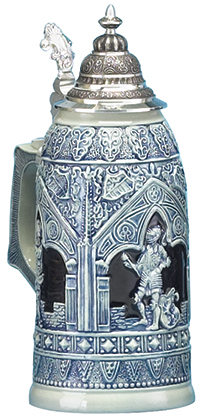 This beautiful stein was inspired by a 100 year old Thewalt and Paulus antique stein exhibiting three arches and intricate ornamentation throughout the domed shape. We have altered the three arches to feature a knight in a three-tone grey, light blue and cobalt blue color combination. An ornamental pewter lid sits boldly on top to complete the stein. Very affordably priced. Limited edition of 5,000 individually numbered pieces.