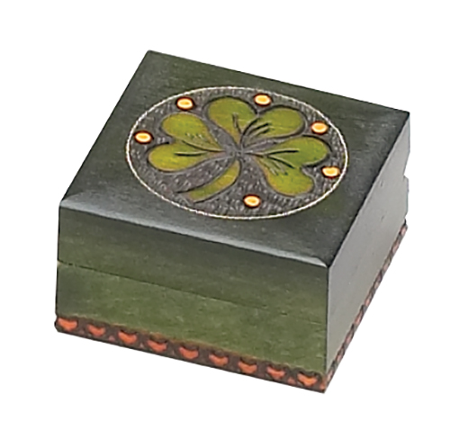 This Irish green box features a carved shamrock inside a metal inlaid circle with yellow circles for accent.