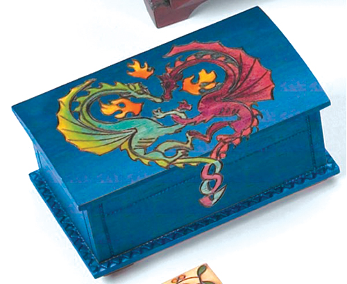 This trick box has a colorful, detailed dragon design featuring two dragons intertwined to form a heart shape on the lid. At first attempt this box does not seem to open, but if you know the trick...slide the front panel to the right and lift the lid!