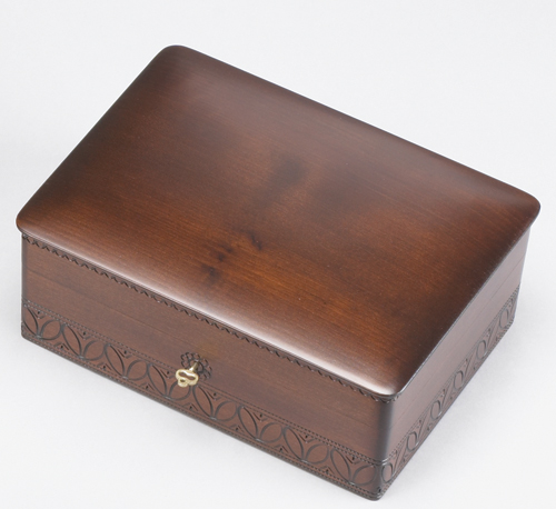 Lock and key, curved lid, hand burned edges. Walnut stain, satin finish.