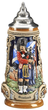 This traditional, full color stein celebrates Scotland, with a raised-relief bagpiper standing in front of a blue and white Scottish flag. A banner along the bottom front of the stein reads "Scotland." The item is finished with an ornamental pewter lid.