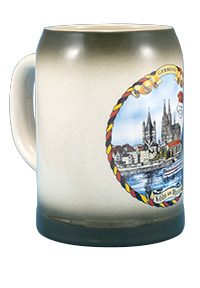 This kannenbaecker mug has bands of green at its base and mouth. It is decorated with a city scene of Koln opposite the handle.