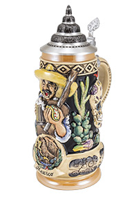 This 0.50L stein is dedicated to Mexico. A mariachi singer hugs his guitar while holding a taco in one hand and a pint of beer in the other. Other things that are important to Mexican culture decorate the sides of the stein, like a sugar skull, cacti, and Mexican ruins.