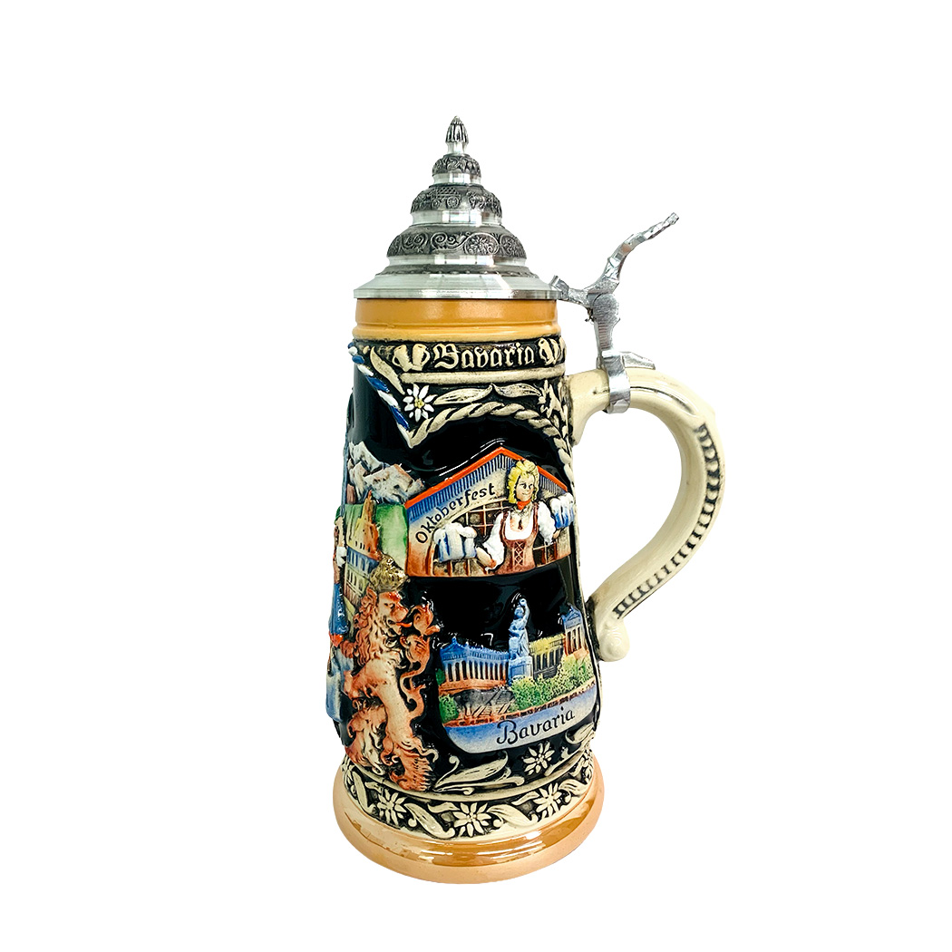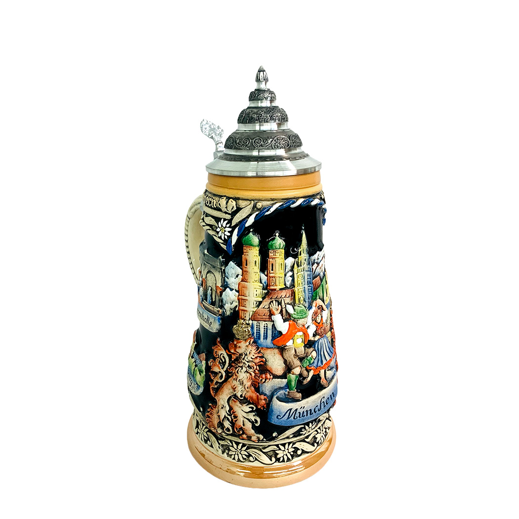 This hand-painted, raised-relief stein has a city scene on the front with two dancers frolicking over a banner that reads "Munchen". The sides of the stein are decorated with famous landmarks and events.