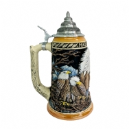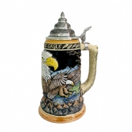 This raised-relief stein has a close up of a large eagle on the front, with the words "Majestic Eagle" above it. The the left is a nest of baby eaglets, and to the right is an eagle hunting.