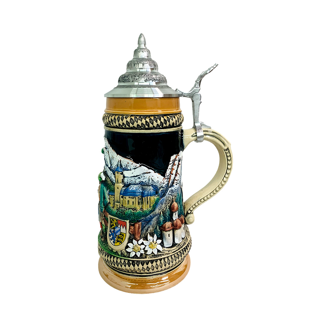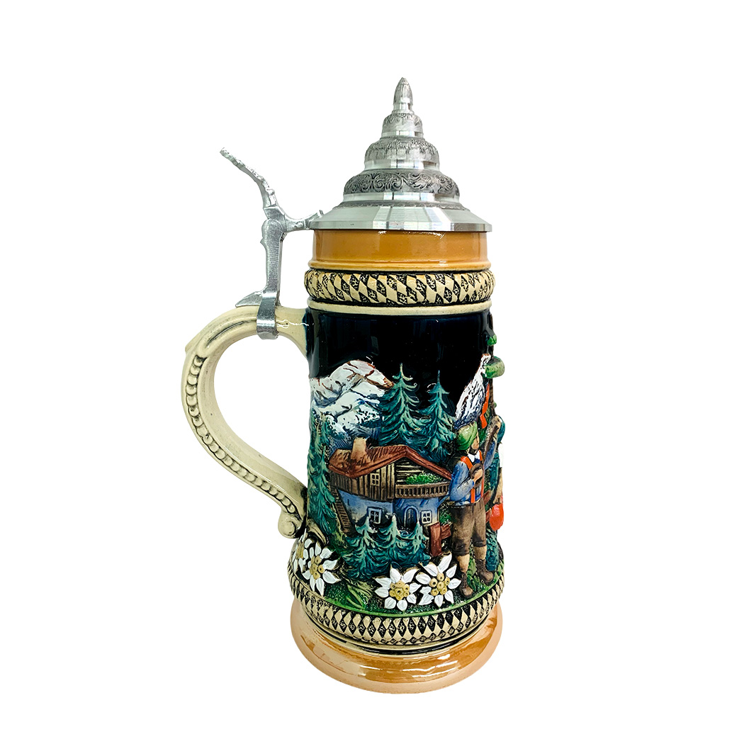 This stein depicts a couple of dancers infront of a mountain scene. It is also decorated with edelweiss flowers and a crest.