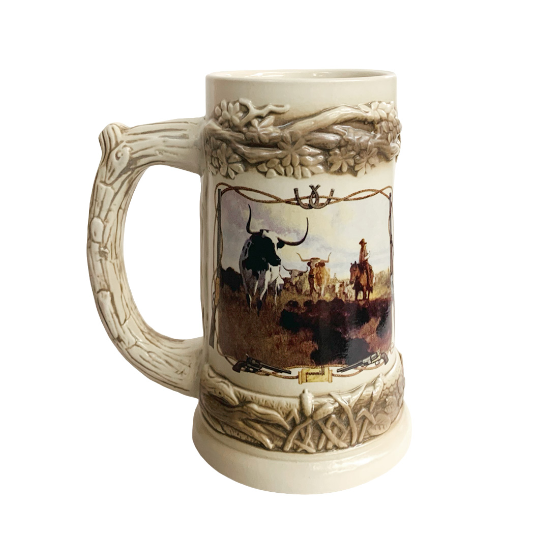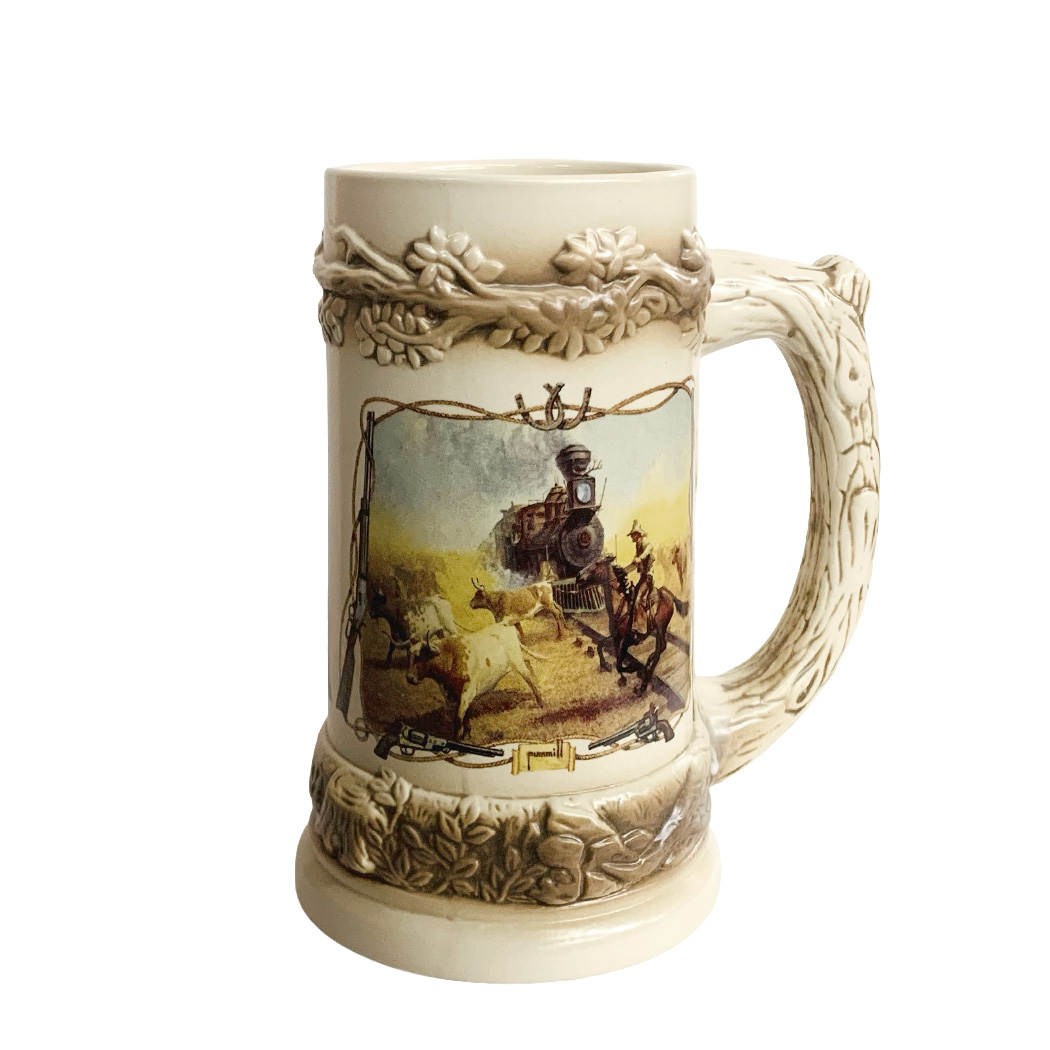 This western-themed, decal-decorated stein shows a man frantically herding cattle accross train tracks as a train comes barreling towards them. The image is bordered with hose shoes and pistols. Raised-relief foliage wraps around the top, bottom, and handle of the stein.